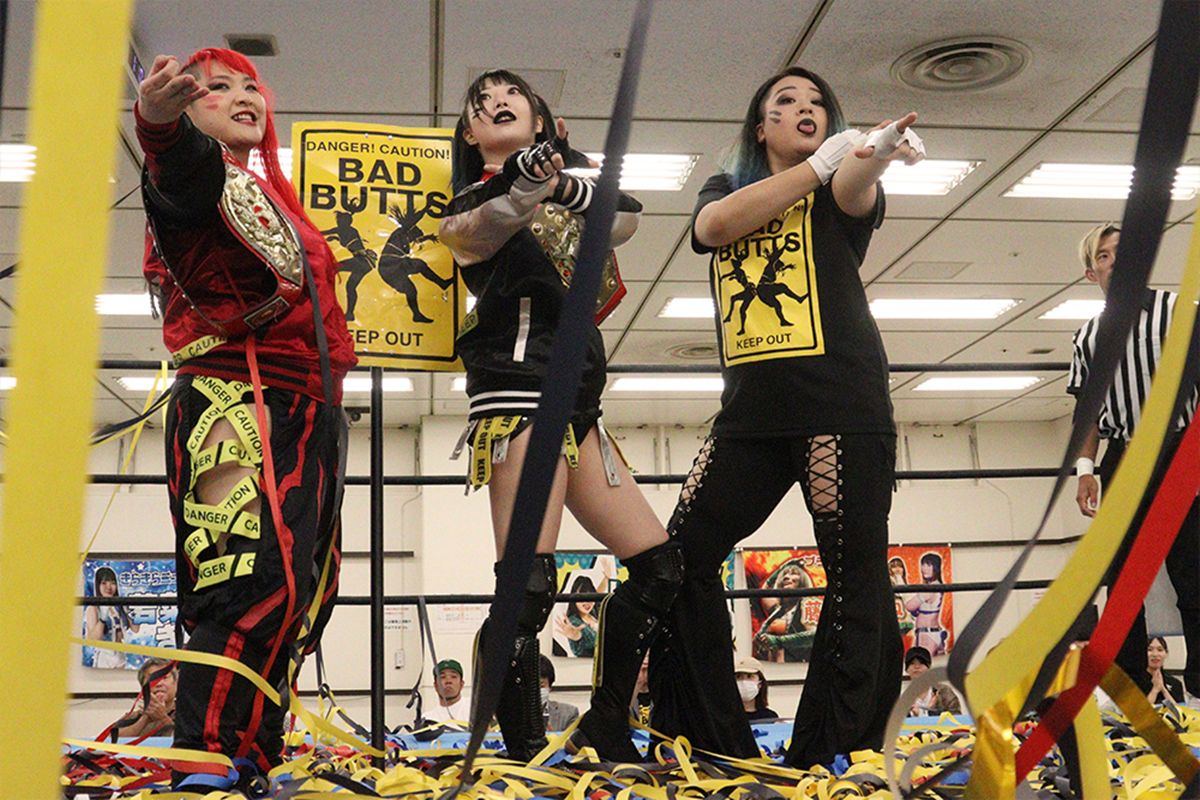 Yappyが戦線に復帰し、新加入の久令愛と初合体。『Bad Butts』がトリオで試合に臨んだ。一方、8月24日の後楽園ホール大会で勝のICE×∞王座に挑む神姫楽は、愛梨紗とのちあぷり、そしてマーズを加えてリングイン。試合前、先発でもめるBad Buttsにちあぷり組が奇襲を仕掛けようとするが、Bad Buttsがヤンキー座りでガンを飛ばし、ちあぷり組がビビるも、杏ちゃむを捉えたちあぷりがダブルタックルを決め、両サイドで腕を取ってマーズと3人でポーズ。Yappyと久令愛がカットに入り、試合は場外戦へ。