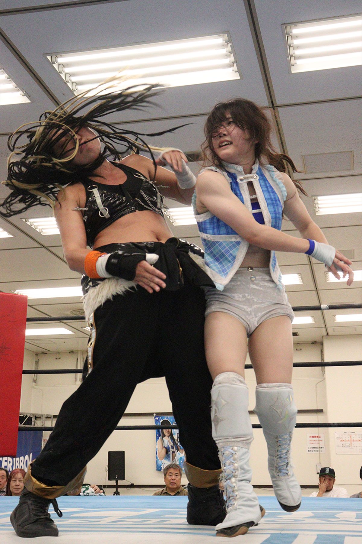 ロックアップでスタートもすぐにヘッドロックを決めた海乃が首投げを決め、再度、ヘッドロックで引き起こすと、ロープを使った目つぶし攻撃から、またも首投げ。引き起こしてのボディスラムでカバーもカウント2。起き上がったミうがエルボー連打で反撃。受け止めた海乃が大きく振りかぶってのエルボーでミうをのけ反らせるも、ミうも負けずにエルボーで反撃。ロープに飛んだミうがタックルを決めカバーもカウント2。