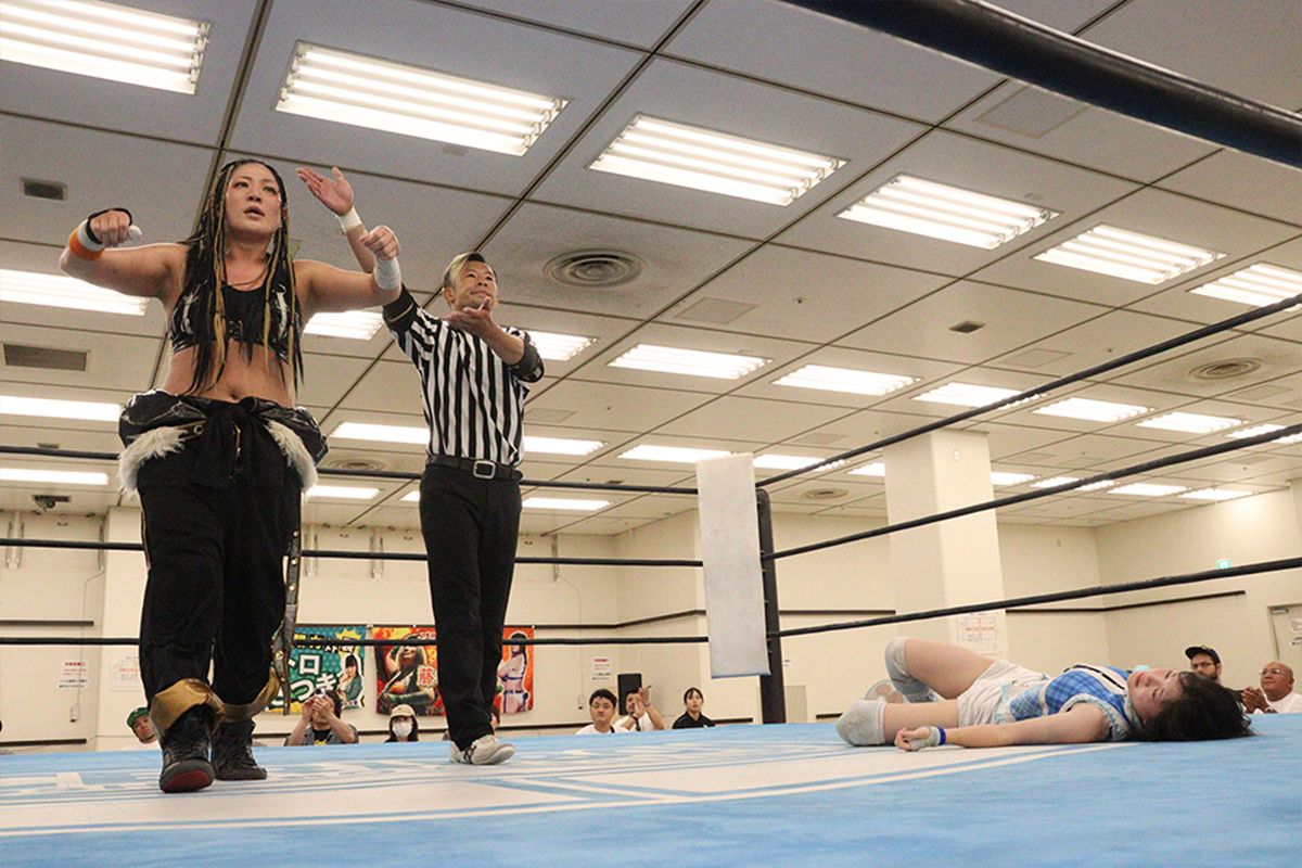 きらりがロールケーキもカウント2。山下がカウンターのラリアット。コーナーに立った山下はきらりがなんとか起き上がったところに飛び込みのラリアットを叩き込み、きらりからカウント3を奪った。