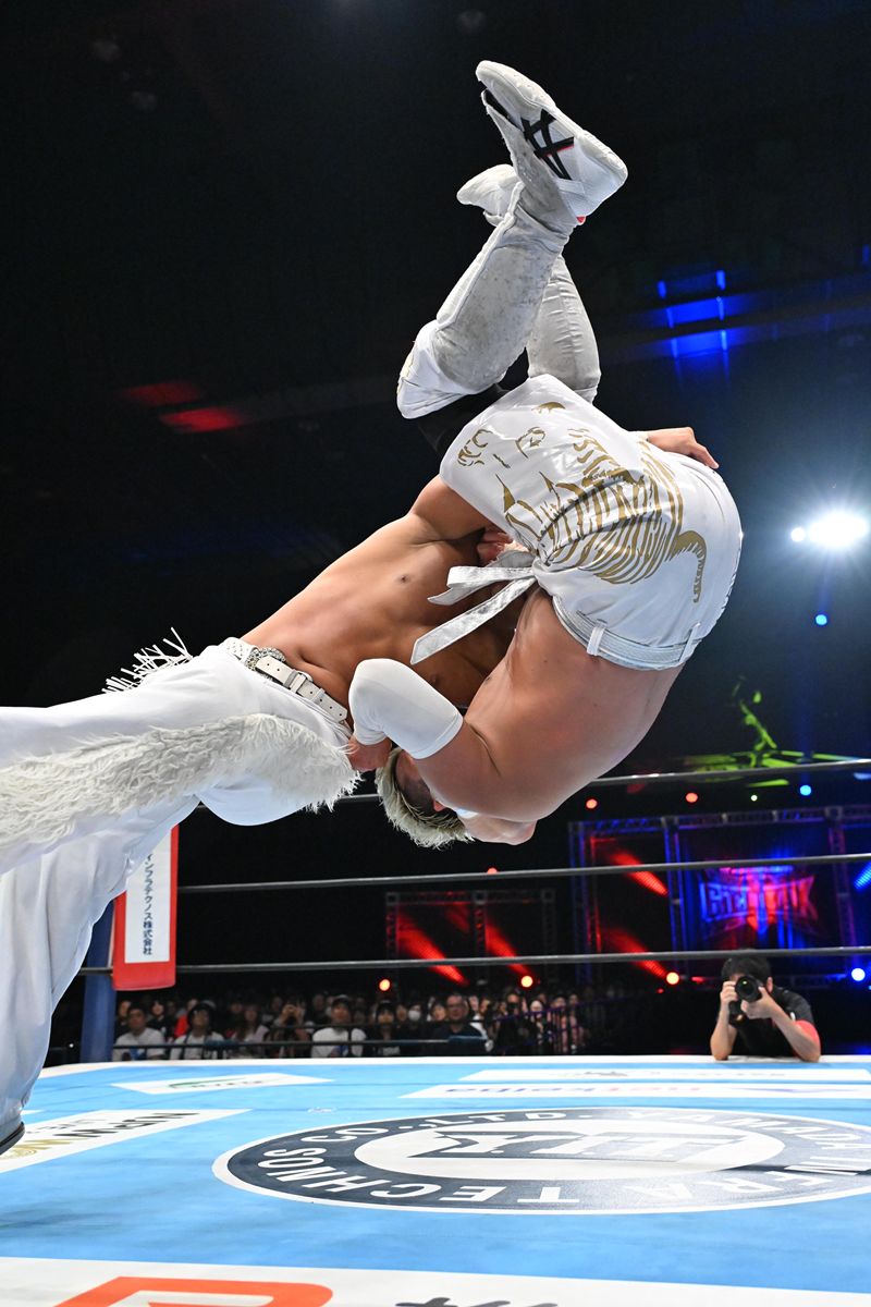 終盤、試合は互いの魂を削り合う、壮絶な死闘となった。YOSHI-HASHIが隠し玉のカナディアンデストロイヤーやドラゴンスープレックスを繰り出せば、海野もハーフネルソンスープレックスやラリアットで応戦。互いに満身創痍の中、一歩も引かない気迫の応酬が続いた。