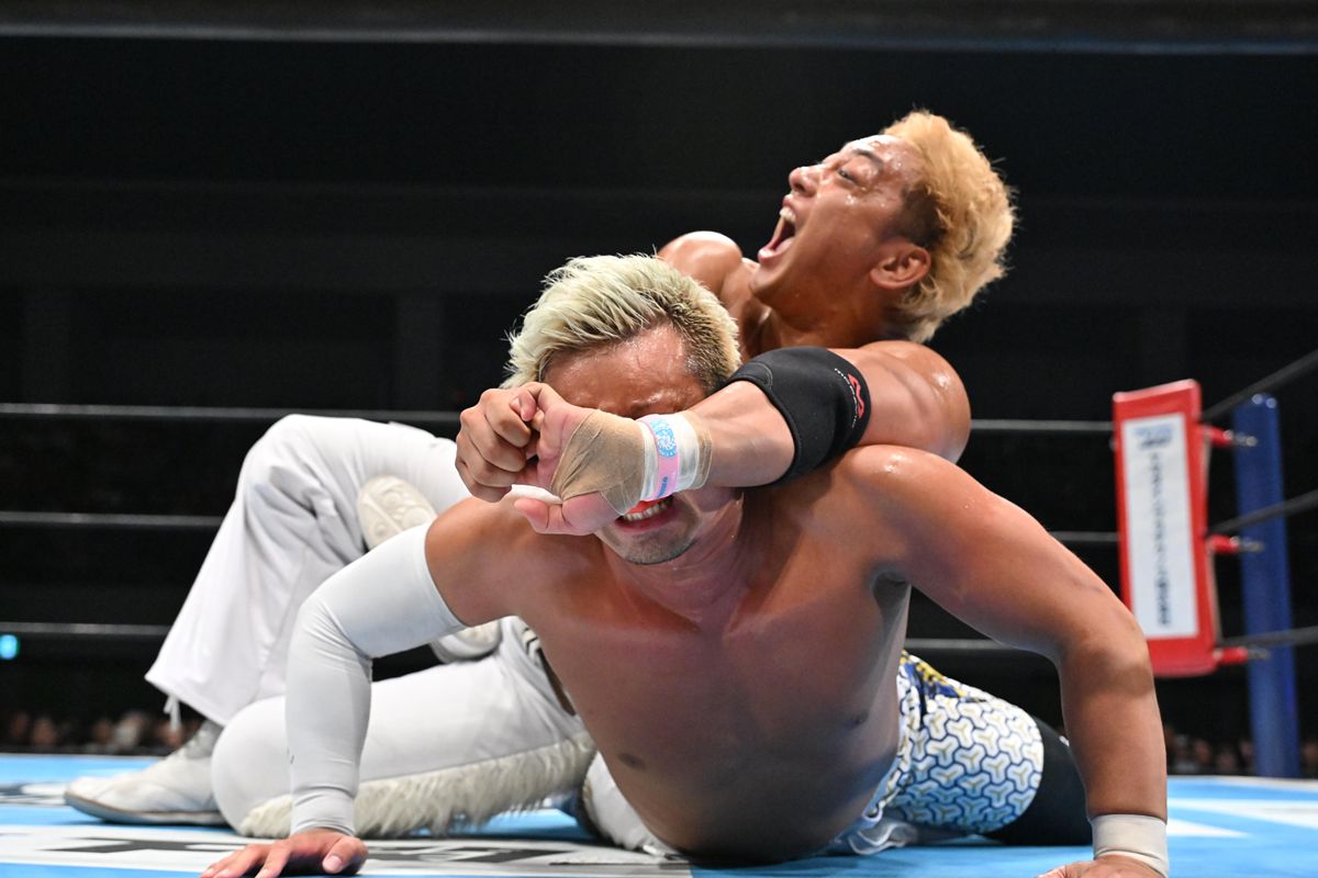 Bブロック公式戦で、新世代の旗手・海野翔太が、開幕から4勝1敗と快進撃を続けていたYOSHI-HASHIとの初シングル対決を制し、その勢いを止めた。この結果、Bブロックの首位戦線は一気に混沌としてきた。
