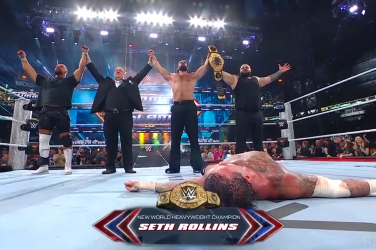 リング上では、ポール・ヘイマン、ブロン・ブレイカー、ブロンソン・リードといった仲間たちと、強奪したベルトを手に喜びを爆発させるロリンズ。