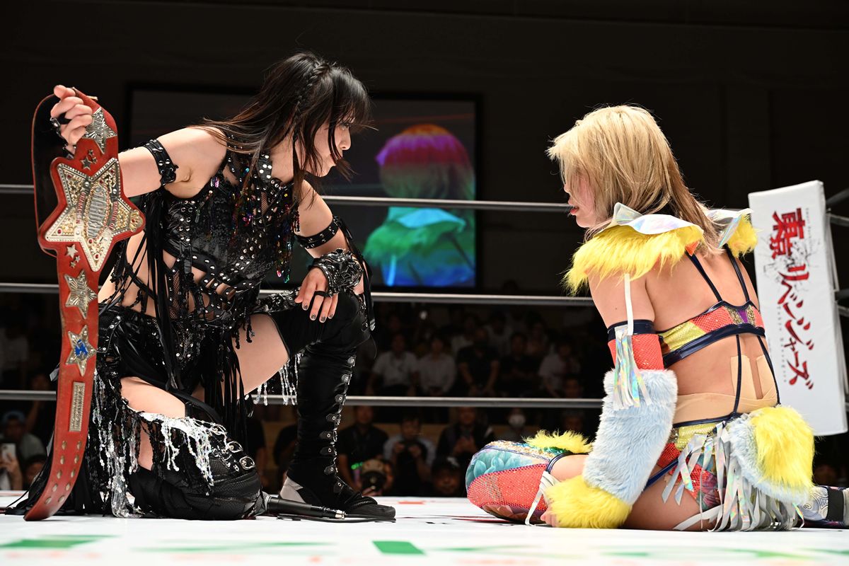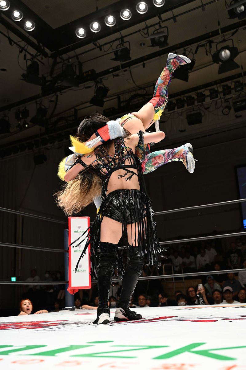 同ブロックでは今大会で星来芽依がリバースシューティングスターでビー・プレストリーを破り、得点を7に伸ばして2位に浮上。上谷も星来も残る公式戦は2試合。星来は残り試合を全勝するのが絶対条件となるが、8・16横浜での上谷戦に逆転での首位獲りを狙うことになる。