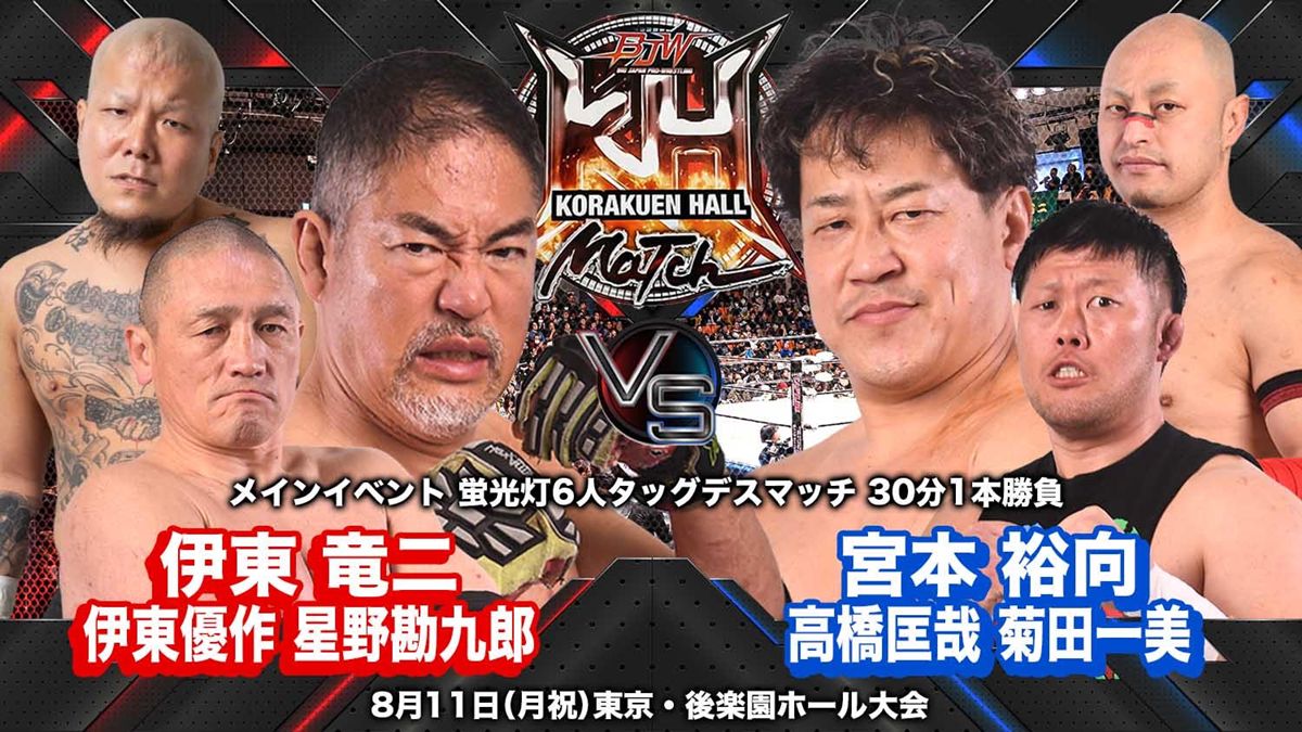 夏の”聖地”を彩るメインイベントには、「蛍光灯100本+Wタワー6人タッグデスマッチ」という豪華な形式のデスマッチが組まれ、伊東竜二&星野勘九郎&伊東優作組と、宮本裕向&高橋匡哉&菊田一美組が激突する。