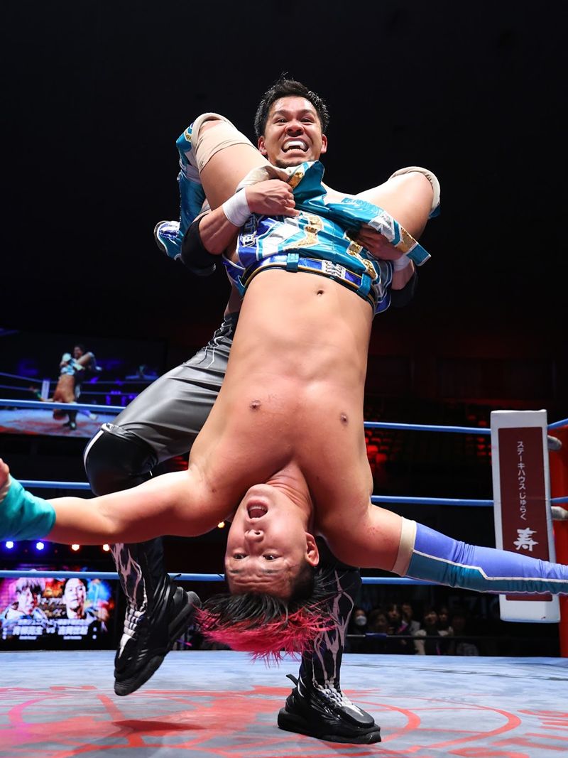 セミファイナルで行われた世界ジュニアヘビー級選手権試合で、地元・松本市出身の青柳亮生が王者・吉岡世起を破り、3度目の王座戴冠。