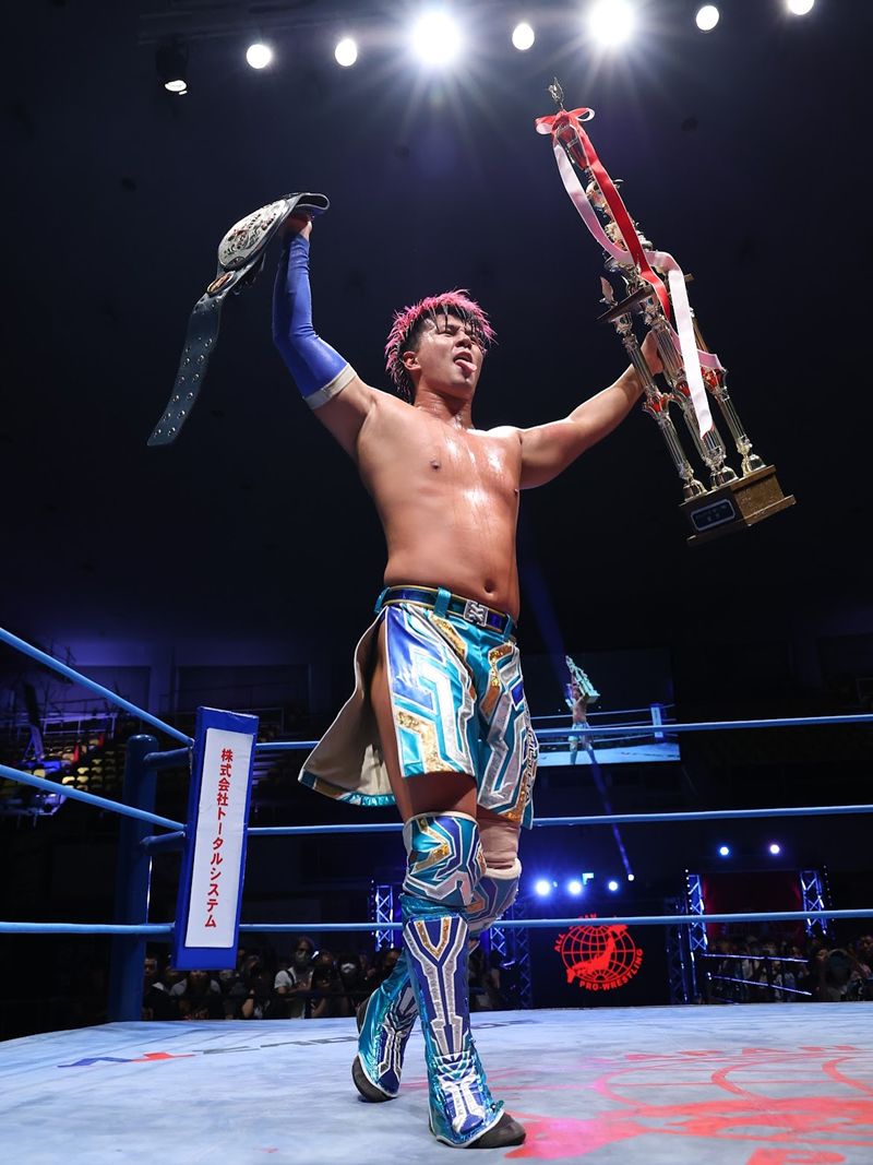 「よっしゃ、ついに帰って来たよ、世界ジュニアが。このトロフィーももちろん嬉しいけど、これ獲るために全日本に入ってきてやってたからさ。ひとまず一安心。でも、ここからだね。ジュニアヘビー級主体の大会は幕を閉じ、また王道トーナメント。別にジュニアヘビー級がエントリーしているわけじゃないんで。そういうところで何ができるか、じっくり考えていきたいと思います。今日はこの喜びに浸りたいと思います」