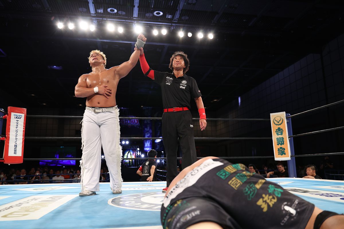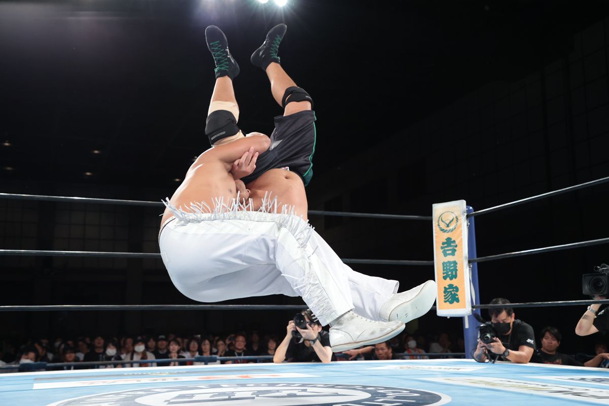 大空スバル式羊殺しからの逆河津落としという必殺パターンで、序盤から試合のペースを完全に掌握する。場外戦でも、鉄柵や観客席を巧みに利用した非情な攻撃で、海野を徹底的に追い込んでいった。