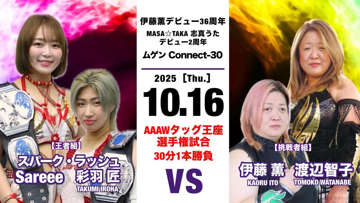 伊藤道場は、10月16日(木)に新宿FACEで開催される『伊藤薫デビュー36周年 & MASA☆TAKA・志真うたデビュー2周年記念 伊藤道場 ムゲンConnect-30』のメインイベントで、AAAWタッグ王座選手権試合を行うことを発表した。