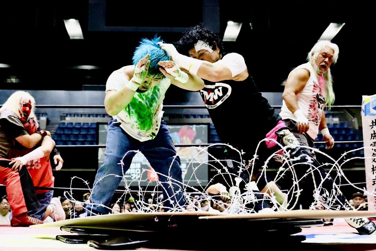 中盤、今井が矢口に捕まり、有刺鉄線ボードに投げられそうになるも、耐えて踏みとどまり、大谷、名島の加勢を得て、逆に有刺鉄線ボードに矢口を押込み形勢逆転。