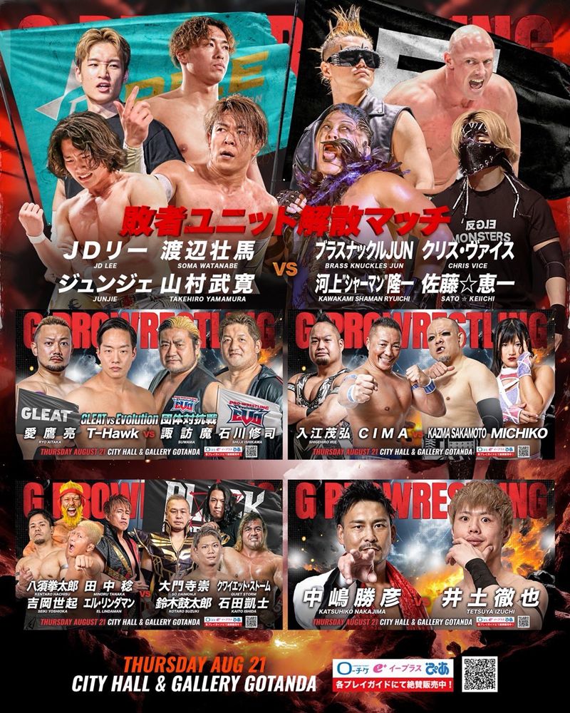 プロレス団体GLEATは8月21日(木)、CITY HALL & GALLERY GOTANDAにて開催される「G PROWRESTLING Ver.93」の対戦カードに緊急の変更が入った。