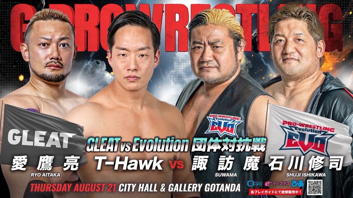 GLEATからは“TRIPLE LOVE HAWK”のT-Hawk & 愛鷹亮が、Evolutionからはプロレス界の怪物タッグ“暴走大巨人”諏訪魔 & 石川修司が迎え撃つ。