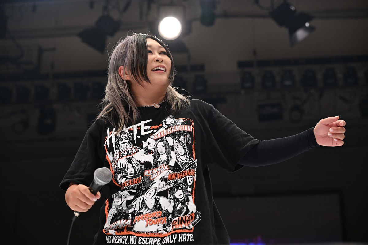 そして、開幕戦(7・27大田区)でSareeeを破った小波が「スターダムで、さすがの嫌われようだな。こんなにスターダムで嫌われちゃって。うらやましいな〜。そんなかわいそうなオマエに汚名返上のチャンスをやるよ。8・23大田区でオマエの持ってるIWGPに挑戦させろ!嫌われ者のオマエはこの挑戦を受けるしかないけどな!」と挑戦要求。