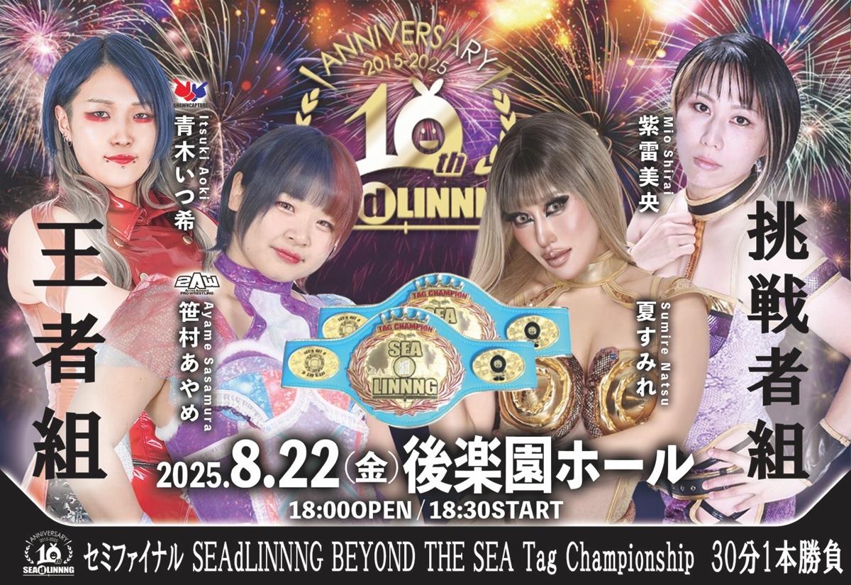 セミファイナルでは、SEAdLINNNG BEYOND THE SEAタッグ選手権試合が行われる。他団体所属ながら王者組として4度目の防衛戦に臨む笹村あやめ&青木いつ希組に、夏すみれ&紫雷美央の曲者コンビが挑戦。安定王者として防衛ロードを歩む若い二人に、経験豊富な挑戦者組が巧みなインサイドワークで揺さぶりをかける。タッグ戦ならではの連携と心理戦が勝敗の鍵を握る一戦だ。