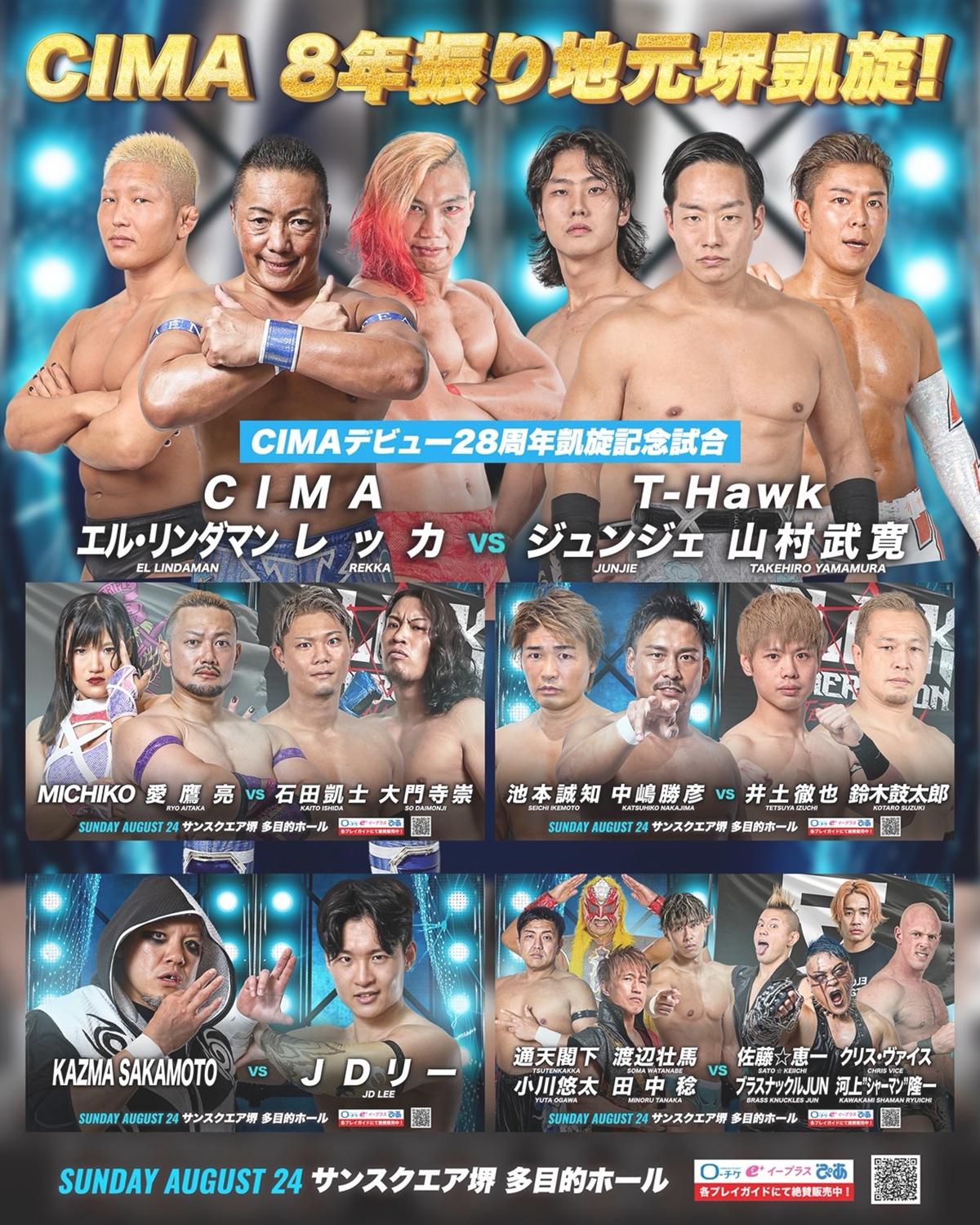 大会のメインイベントを飾るのは、「CIMA28周年凱旋記念スペシャル6人タッグマッチ」。主役のCIMAが、エル・リンダマン、レッカと組んで、T-Hawk、山村武寛、ジュンジェ組と対峙する。