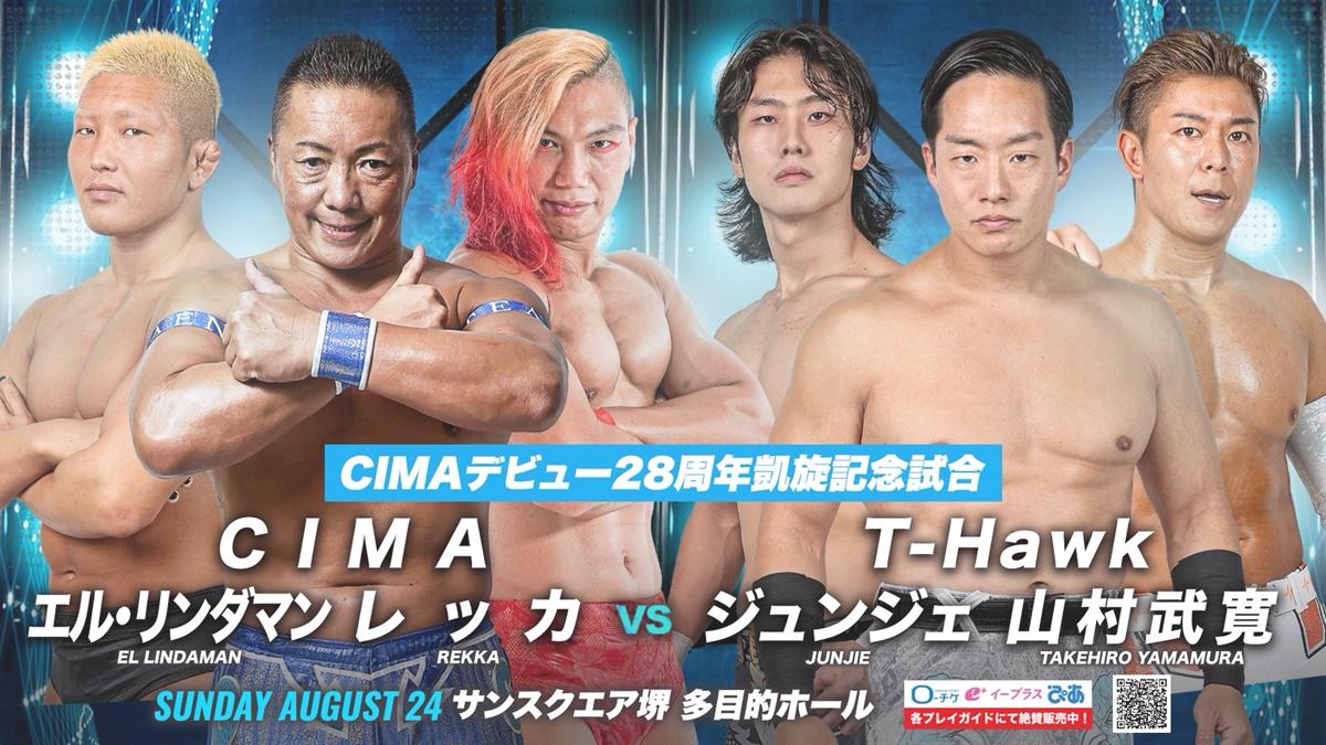 大会のメインイベントを飾るのは、「CIMA28周年凱旋記念スペシャル6人タッグマッチ」。主役のCIMAが、エル・リンダマン、レッカと組んで、T-Hawk、山村武寛、ジュンジェ組と対峙する。