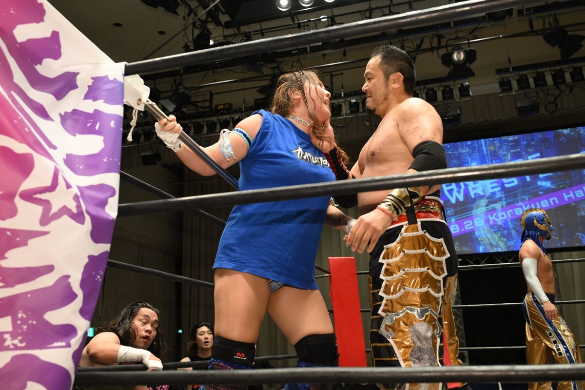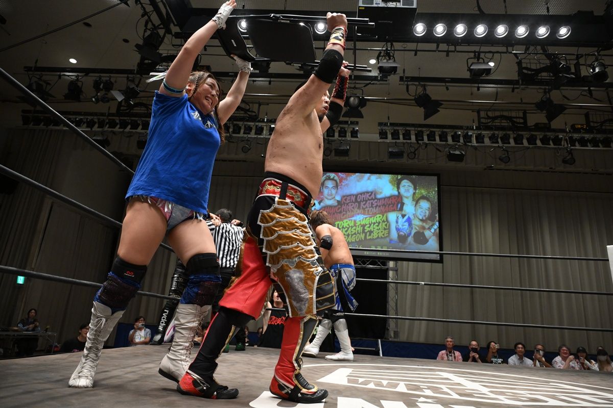 両軍の対抗戦は8・11高島平区民館、FREEDOMSの横浜武道館で行われガンプロ軍が連勝。この日は大家健&勝村周一朗&冨永真一郎が佐々木貴&杉浦透&ドラゴン・リブレと対戦した。ゴングが鳴る前から開戦し、場外戦に発展。セコンドに就いていたまなせは居ても立っても居られず、要所要所で介入。