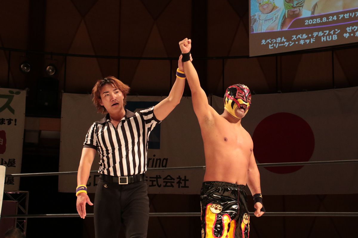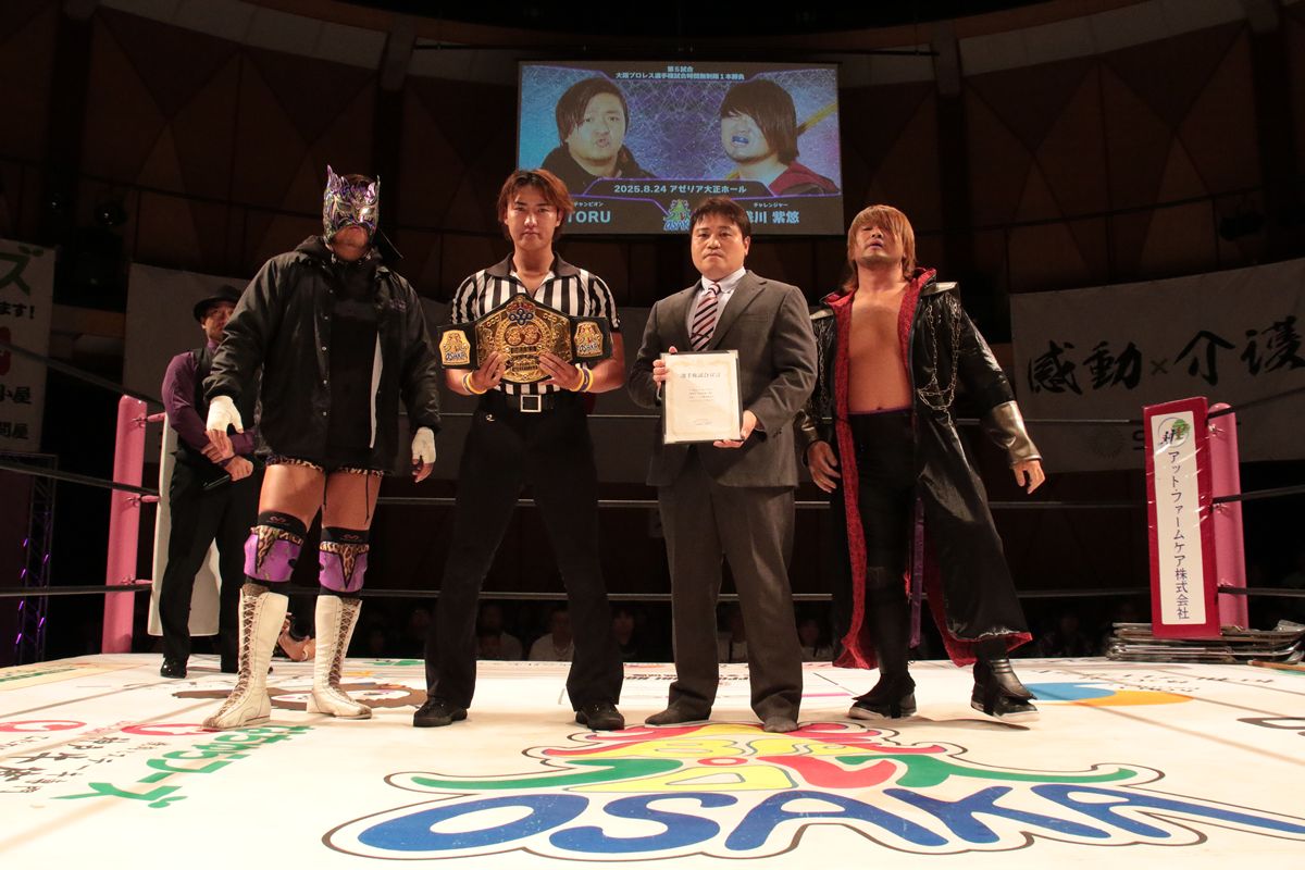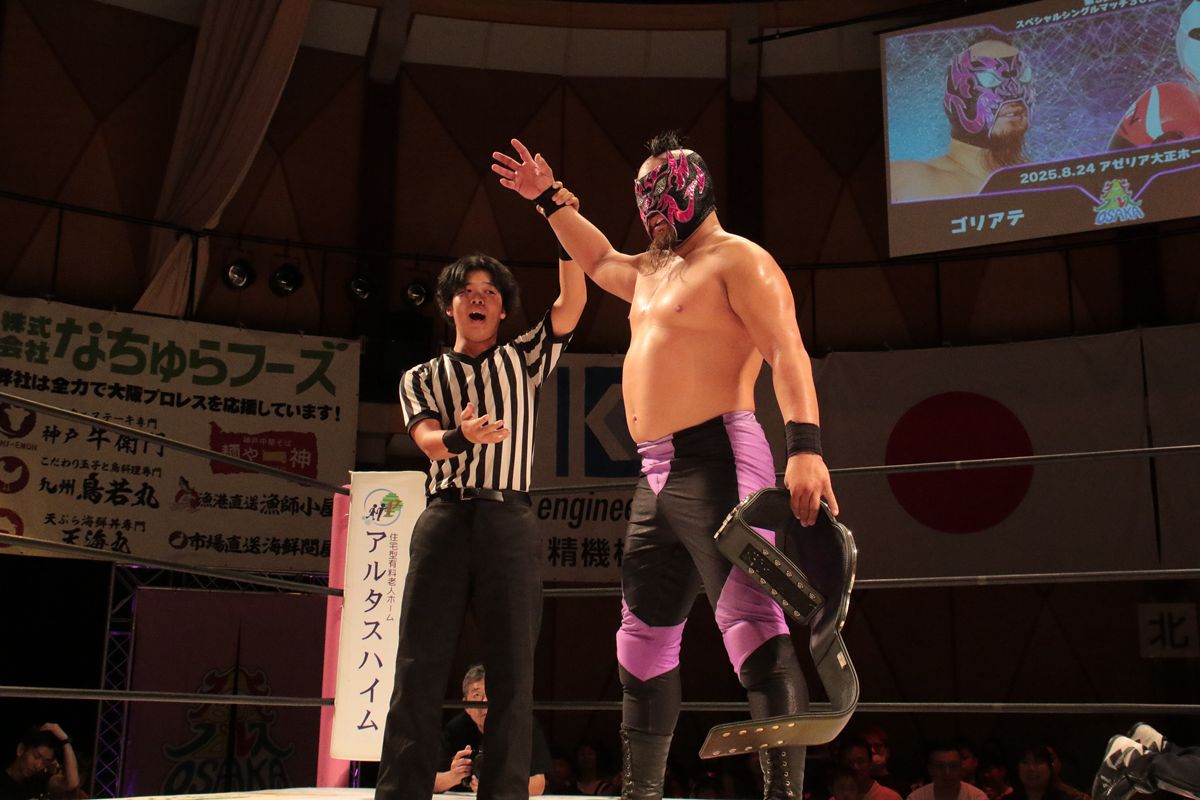 大阪プロレスは24日、大阪市のアゼリア大正ホールで「夏祭り2025」を開催し、335人の超満員札止めの観衆を集めた。メインイベントで行われた大阪プロレス選手権試合は、王者TORUが挑戦者の浅川紫悠を反則裁定なしのノーDQマッチの末に下し、5度目の防衛に成功した。
