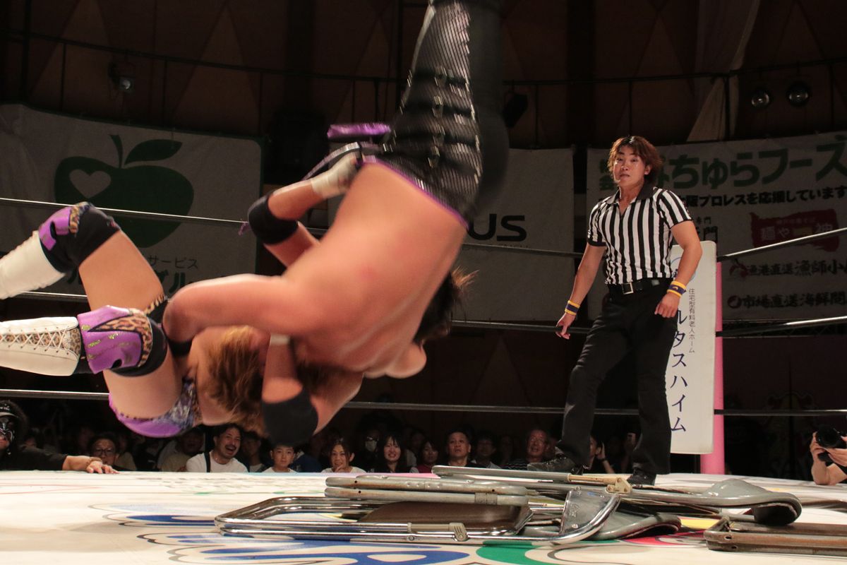 中盤、ペースを掴んだTORUがテーブルを持ち出すが、浅川にそれを阻止され、逆にテーブルの上に頭から落とされてしまう。