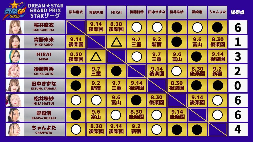 一方のSTARリーグは、桜井麻衣、松井珠紗、野崎渚の3名が勝ち点6で首位に並ぶ混戦模様を呈している。