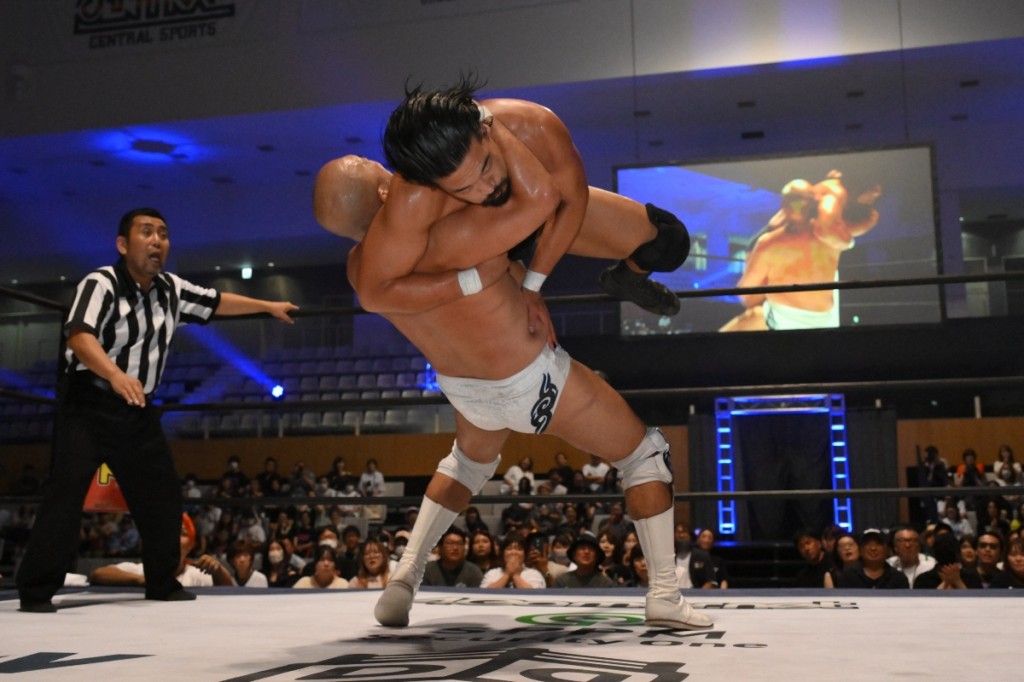 ならばとリストクラッチ式エクスプロイダーにいくも、2カウントで返した樋口は下からクローで締め上げ、起き上がるとクロースラムも2カウント。樋口は渾身の力でクローで締め上げて3カウントを奪った。