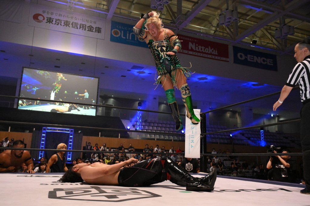 岡谷がTシャツを脱ぐと、飯野とエルボーのラリー。岡谷が飯野に逆打ちもカウントは2。飯野が岡谷にバックフリップ、納谷がダイビング・エルボードロップを投下すると、セコンドのイルシオンがレフェリーの足を引っ張って阻止。