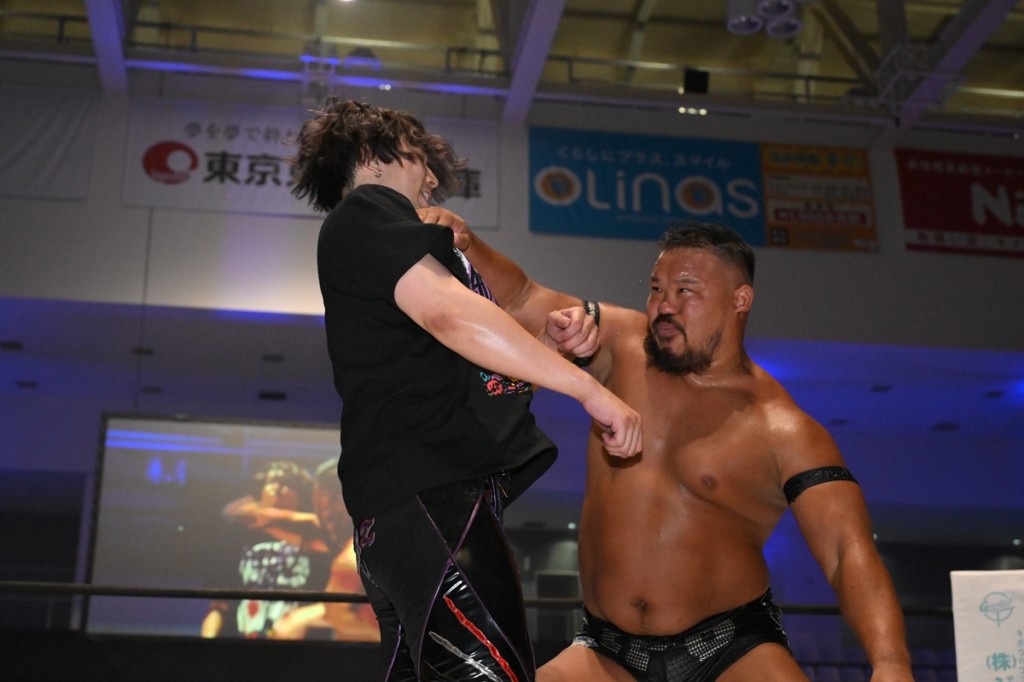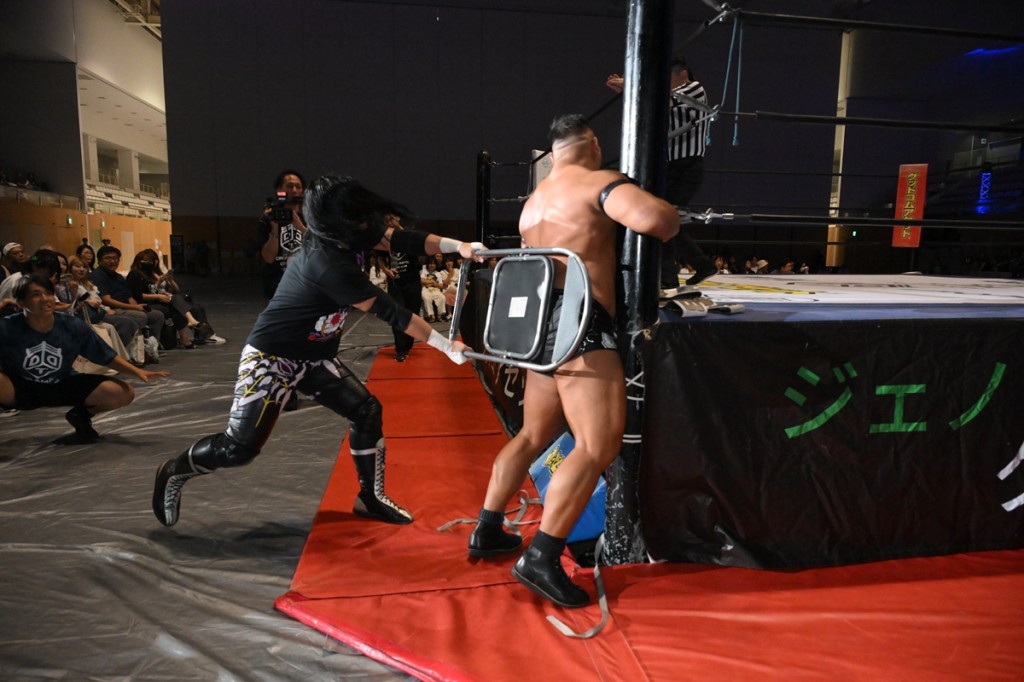 試合は開始早々、場外戦となり、ダムネーションT.Aがイスでやりたい放題。佐々木、岡谷が飯野にダブルブレーンバスターを決めれば、飯野は佐々木にエルボー、ショルダータックルを叩き込む。飯野が岡谷にチョップ連打、納谷が岡谷にビッグブーツをぶちかます。