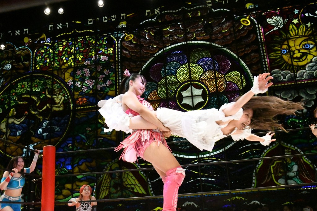 この日、瑞希は風城ハル、凍雅を、渡辺はHIMAWARI、鈴木志乃をそれぞれパートナーに6人タッグマッチで激突した。瑞希と渡辺が互いに試合権利を持った状態で相対したのは中盤の一度きり。渡辺が瑞希のカサドーラを切り返してのリバース・ジャイアントスイングを披露すれば、瑞希も渡辺をコーナー2段目のセットしてのダイビング・フットスタンプをエグく見舞うなど互角の攻防を繰り広げた。