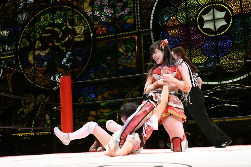 上福&上原の“Ober Eats”はこの日、中島&高見汐珠組と対戦。挑戦者組がさすがの連係を披露すると、最後は孤立する高見に上原が新技のスシ・トルネード(変形フェースバスター)を公開して3カウント奪取した。