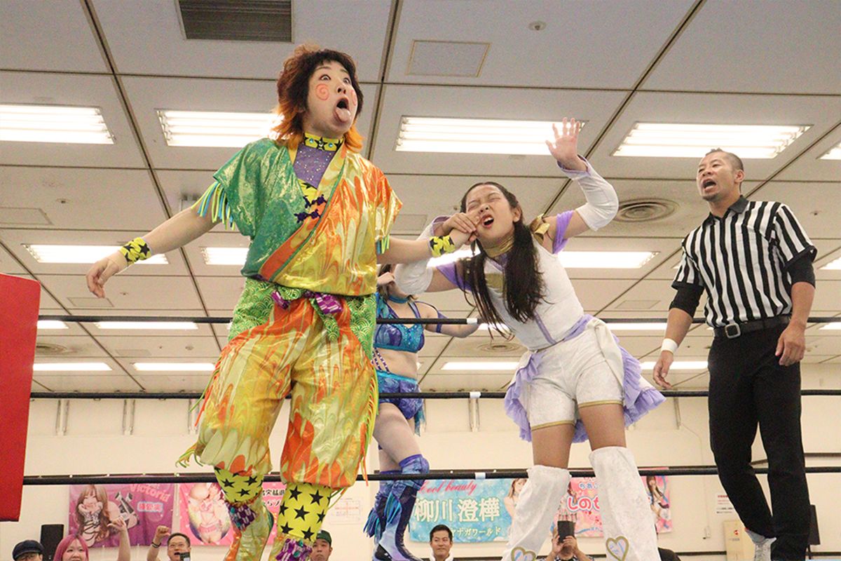 夏休み最後の試合で年の差36歳のキクに挑んだりこ。ヘッドロックを決められたりこがキクをロープに振り、うつ伏せになるが、踏ん張って立ち止まると、りこにキクがストンピング。さらにコーナーに叩きつけての踏みつけ攻撃。対角コーナーにりこを振ったキクが飛び込むもかわしたりこがエルボー、串刺しドロップキックでカバー。カウントは2。りこがボディスラムを狙うが、こらえたキクがボディスラムでカバーもカウント2。