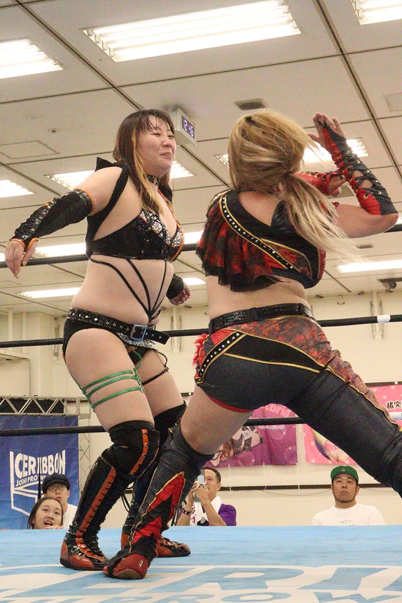 勢いに乗るB.B.=Bad Buttsがトリオでそろい踏み。対するは前回、B.B.と組むも、最終的にB.B.敗戦の原因を作ったトトロと、リボンタッグ奪回のチャンスを狙うきらミク。先発に出たきらりをB.B.が3人がかりで急襲。串刺し3連発から3人でコーナーに追い込んでの踏みつけ。久令愛がきらりをキャメルクラッチに決め、さらに額に噛みつき。代わったYappyが変形ジャイアントスイング。エプロンに出た杏ちゃむとYappyが餅つきヒップアタック。