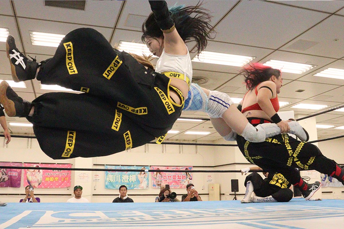 あかねが2人まとめてタックルで吹っ飛ばし、楓歩を持ち上げようとするが着地した楓歩の蹴り足をあかねがキャッチ。楓歩がロープに飛んでのタックル、STO。膝立ちのあかねに楓歩がバズソーキックもあかねが蹴り足をキャッチ。コーナーに投げての串刺し攻撃もかわした楓歩がロープ掴みのハイキック、コーナー2段目からのドロップキックでカバーもカウント2。代わったいぶきがロープ際のあかねに飛び込みニー、飛び込み顔面ウォッシュ。いぶきがチョップもあかねがかわす。
