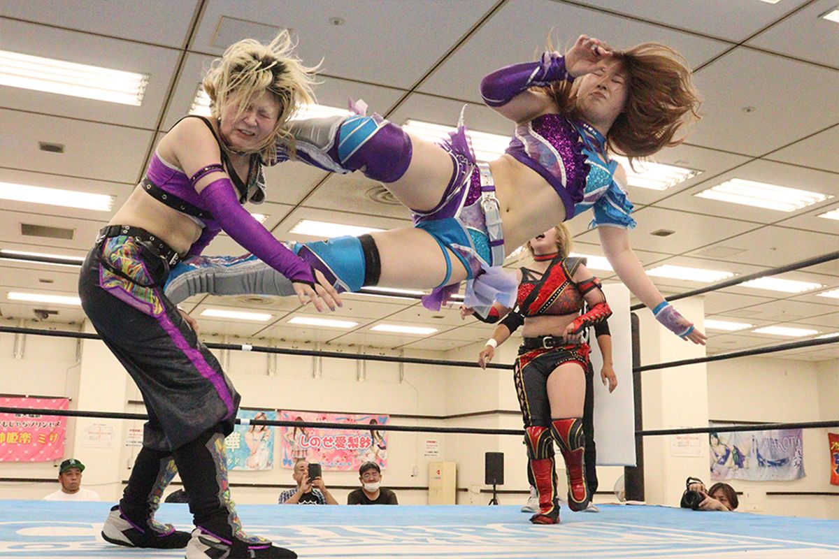 あかねが2人まとめてタックルで吹っ飛ばし、楓歩を持ち上げようとするが着地した楓歩の蹴り足をあかねがキャッチ。楓歩がロープに飛んでのタックル、STO。膝立ちのあかねに楓歩がバズソーキックもあかねが蹴り足をキャッチ。コーナーに投げての串刺し攻撃もかわした楓歩がロープ掴みのハイキック、コーナー2段目からのドロップキックでカバーもカウント2。代わったいぶきがロープ際のあかねに飛び込みニー、飛び込み顔面ウォッシュ。いぶきがチョップもあかねがかわす。