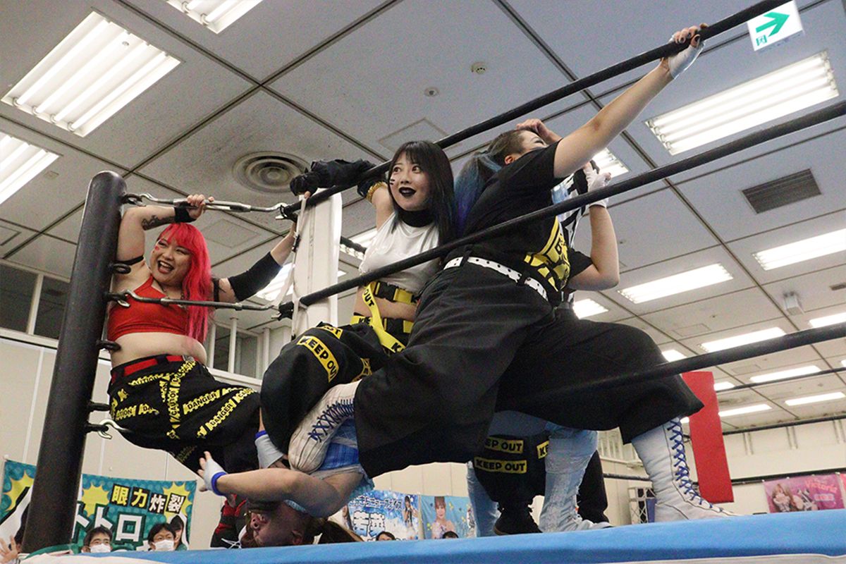 Yappyが串刺し開脚ヒップアタック。杏ちゃむがダイビングフットスタンプ。Yappyがギロチンドロップでカバーもカウント2。ロープに飛んだYappyにトトロが飛び込みラリアット。トトロがボディプレスでカバーもカウント2。代わったミクをトトロが抱え上げ2階からのドロップキック。さらにミクをYappyの上にトトロが落とす。ミクがカバーもカウント2。ミクがカサドーラを狙うもYappyがそのまま抱え上げて投げ飛ばしカバーもカウント2。