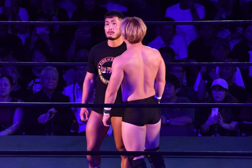 第1試合では新日本プロレスの永井大貴とOSWの小藤将太がシングルマッチで激突。永井のセコンドには鷹木信悟、小藤のセコンドには井上雅央がつく布陣となった。
