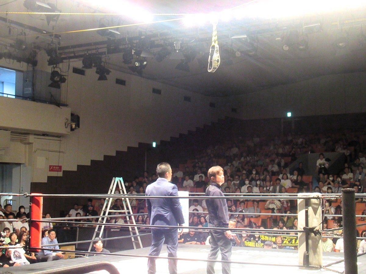 するとシュンはセコンド陣を見渡すと、8・5後楽園でデビューしたばかりの木村和真をリングに上げ、「いけるよな?」と強引に握手を交わす。ISHINは「木村?デビュー2ヵ月目。大歓迎だ。今の俺たちは最強だぞ。このトライアングルゲートを懸けた試合がオマエのプロレスラー人生の最後の試合にしてやるよ。やってやるよ」と受諾してしまう。こうなると斎藤GMもGOサインを出さざるを得ず、決戦の場を10・8後楽園に指定した。