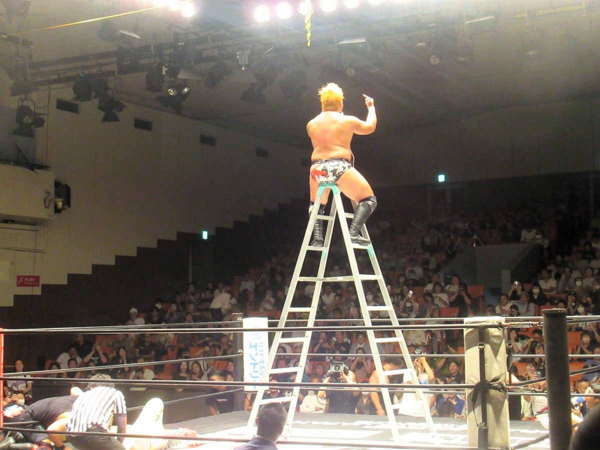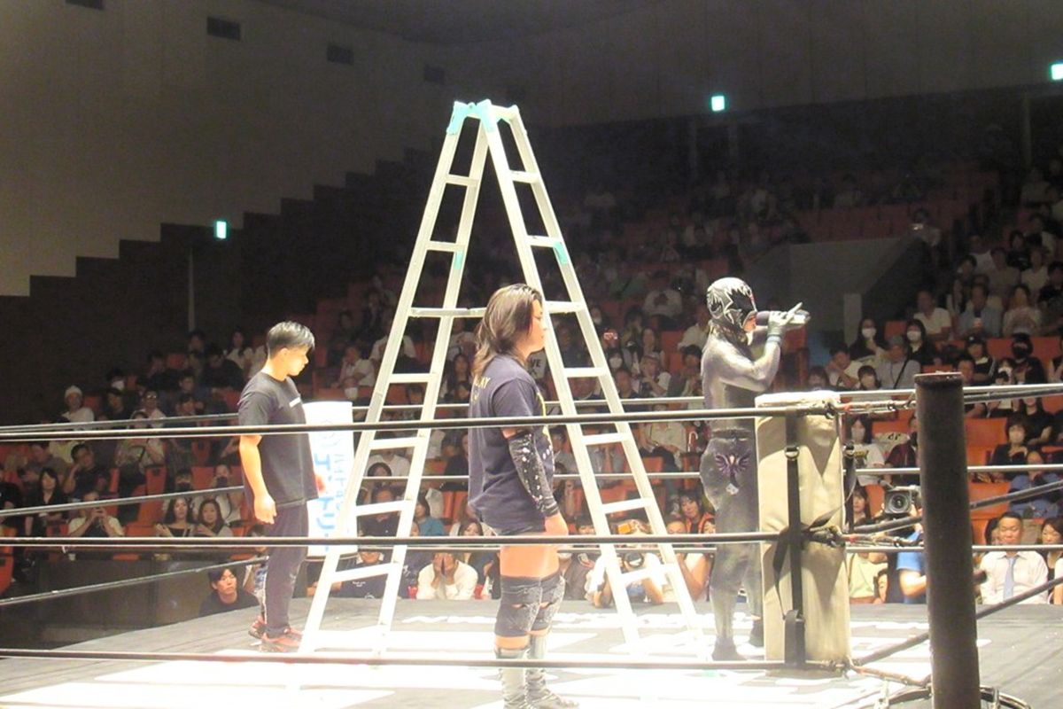 この日のメインイベントでオープン・ザ・トライアングルゲート王者のチーム・メヒコ(フラミータ、ルイス・マンテ、ベンディート組)が我蛇髑髏(がじゃどくろ=Z-Brats改め)のKAI、ISHIN、加藤良輝組とラダーマッチで激突。リングの上方に張られたロープにベルトが吊るされ、ラダーを上って、そのベルトを奪ったチームが勝者となる試合形式だ。