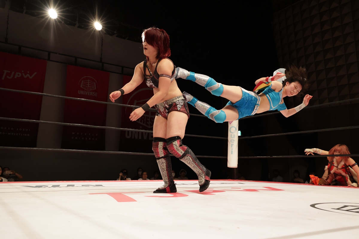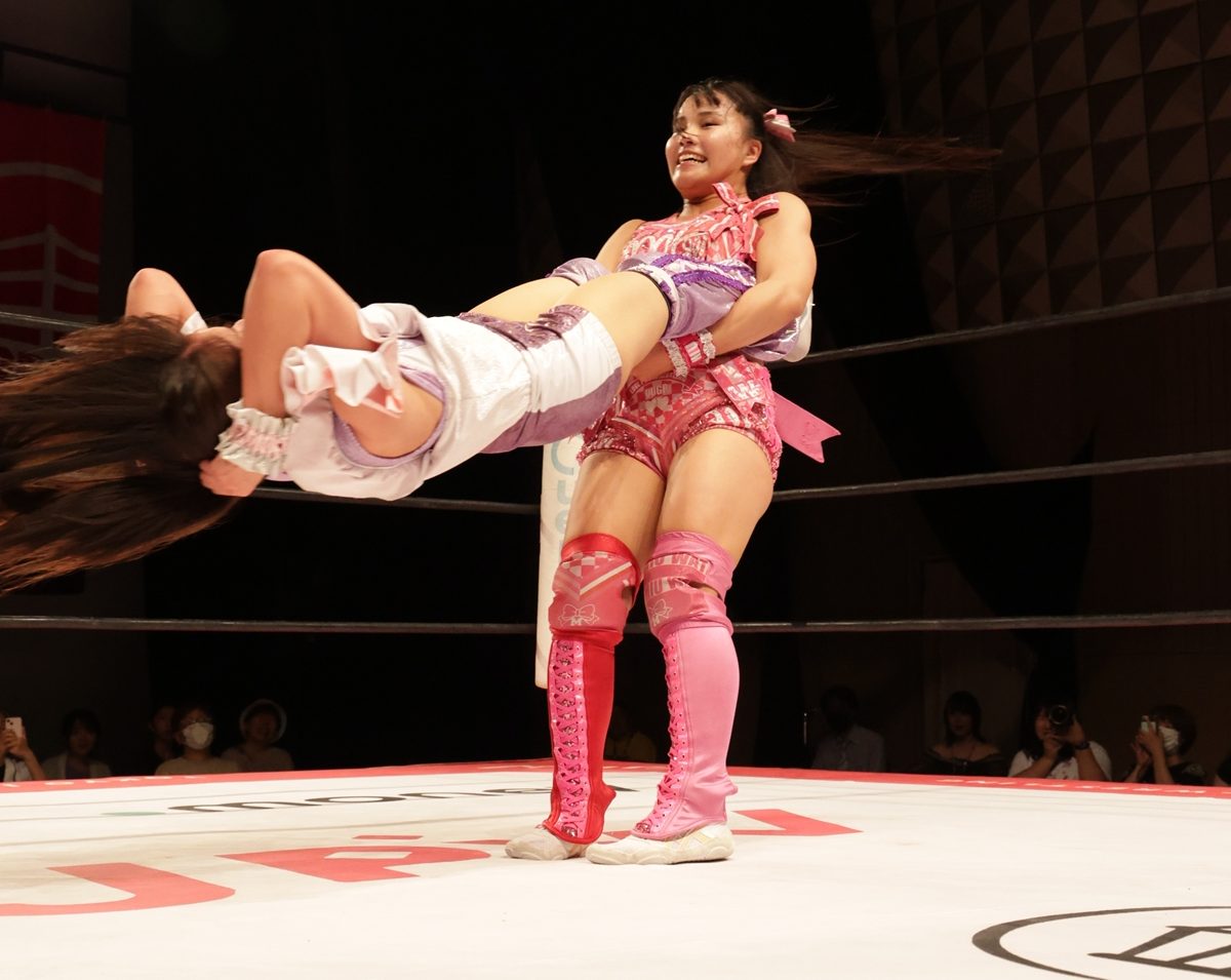 第5試合では9・20大田区でのビッグマッチでプリンセスタッグ王座(王者は中島翔子&ハイパーミサヲ)に挑戦するOber Eats(オーバーイーツ)の上福ゆき&上原わかなが荒井優希&芦田美歩の京都タッグを破り、好調ぶりをアピールした。