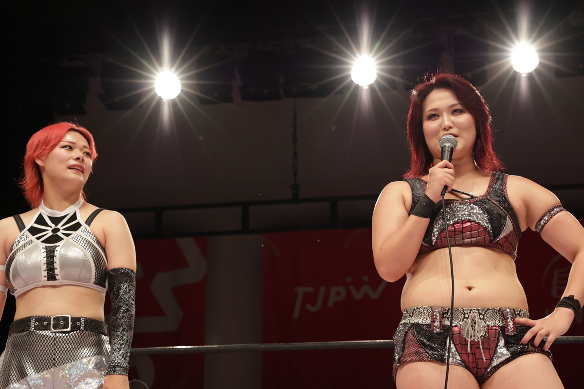 マイクを持った山下が「今日は女性限定ということで、これはこれでいいね。めちゃめちゃ応援してくれて。東京女子って、いつもファンの方がやさしいし、この空間が私は好きなんだよね」と言えば、凍雅は「女性限定興行のメイン、2回連続なんですけど、それよりも成長した姿を見せられたし、女の子の前でキャーキャー言われて、うれしかったです。まだまだ魅力が詰まった東京女子なので見に来てくれるとうれしいです」と笑み。続けて、山下は「いつでもどこでも待ってるし、東京女子を大好きでいてくれるみんなのために、ここで全力で戦います。これからも応援よろしくお願いします! 今日は来てくれてありがとうございました。また来てください! 限界、自分で決めんなよ!」と締めくくった。