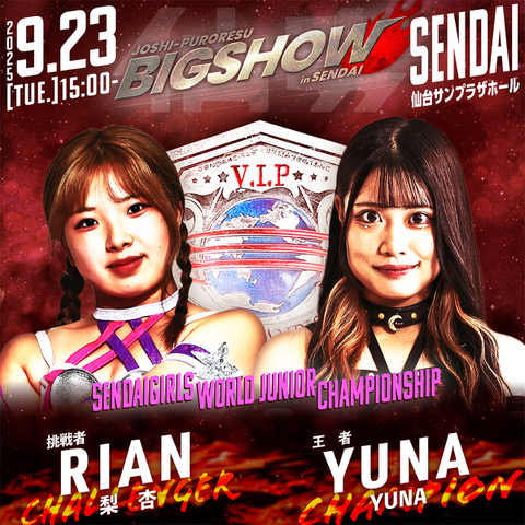 さらに、センダイガールズワールドジュニア選手権試合、(王者)YUNA vs (挑戦者)梨杏の一戦も決定。王者YUNAにとっては、その真価が問われる初防衛戦となる。次世代の選手たちによるフレッシュで激しいベルト争いも、大会の重要な見どころとなる。