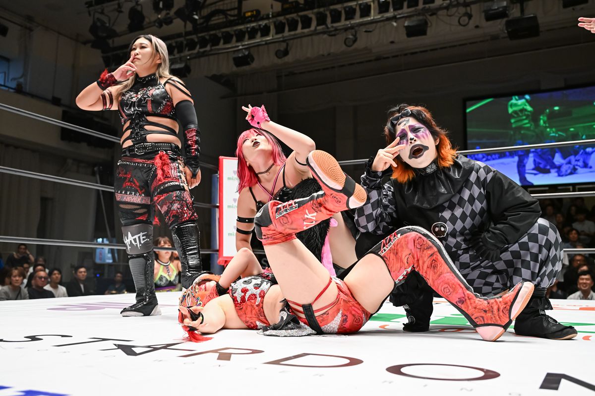 H.A.T.E.は序盤から場外乱闘やラフファイトで試合のペースを握ると、終盤にはセコンドが介入し、吏南がイスでキッドを殴打。