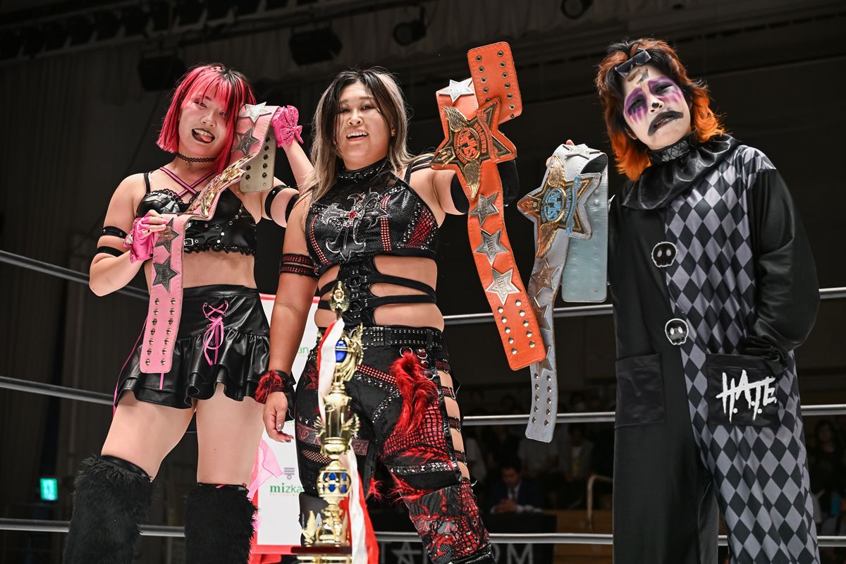 女子プロレス団体スターダム9月10日の東京・後楽園ホール大会で行われたアーティスト・オブ・スターダム選手権試合で、挑戦者組の小波&吏南&フキゲンです★が、王者組のスターライト・キッド&AZM&天咲光由を破り、第35代王座を戴冠。