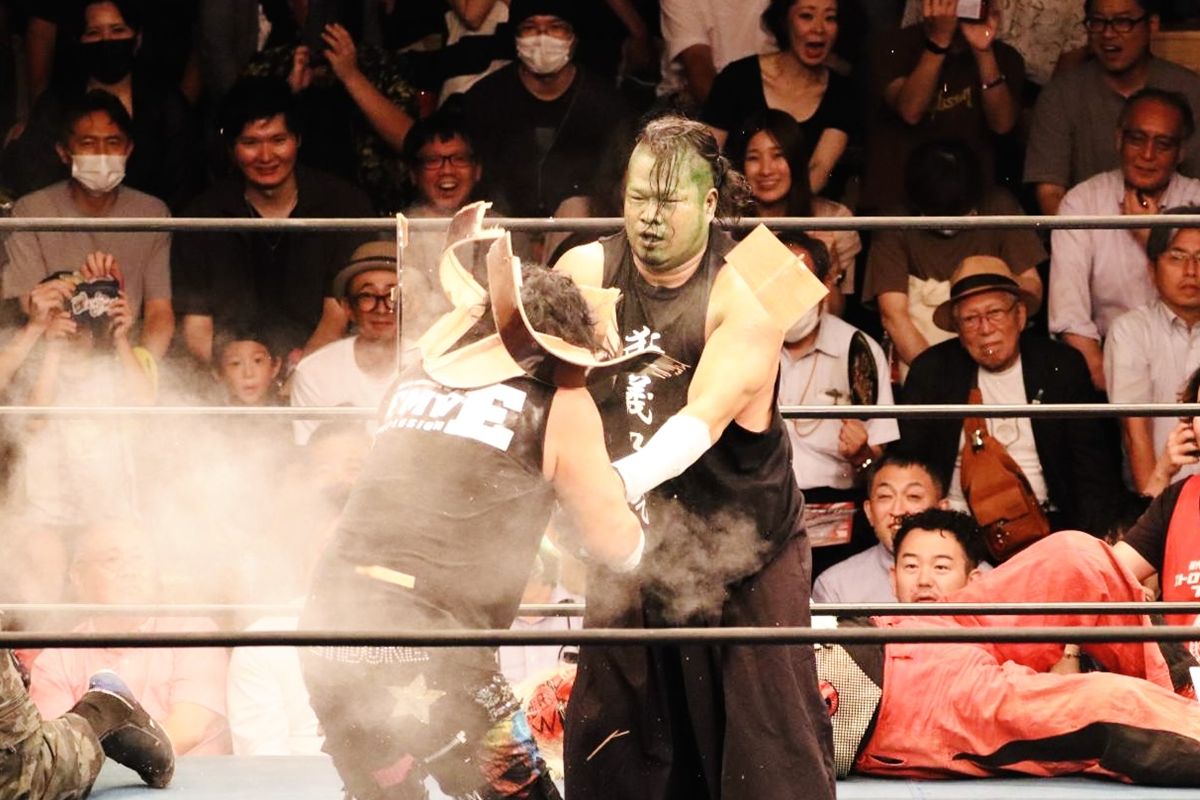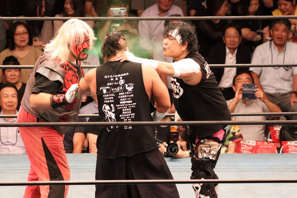 大仁田と矢口のダブル毒霧で間下が捕まり、竹刀のトリプル攻撃など、邪道軍の息のあった攻撃に劣勢が続くSSPW軍。
