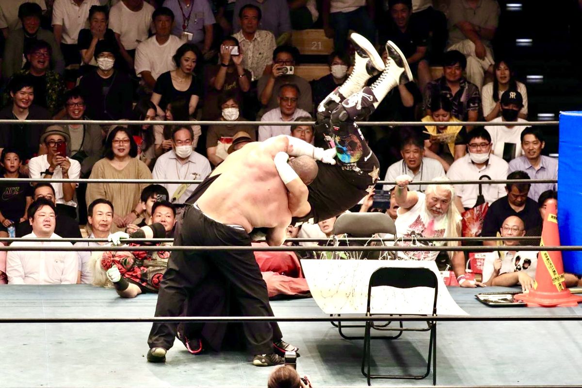 リングアナのコールが終わらぬうちに、間下へ水を吹きつけ場外乱闘へなだれ込んだ大仁田は、場外で間下を椅子で強打し、座面を抜くなどやりたい放題。