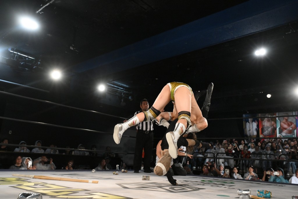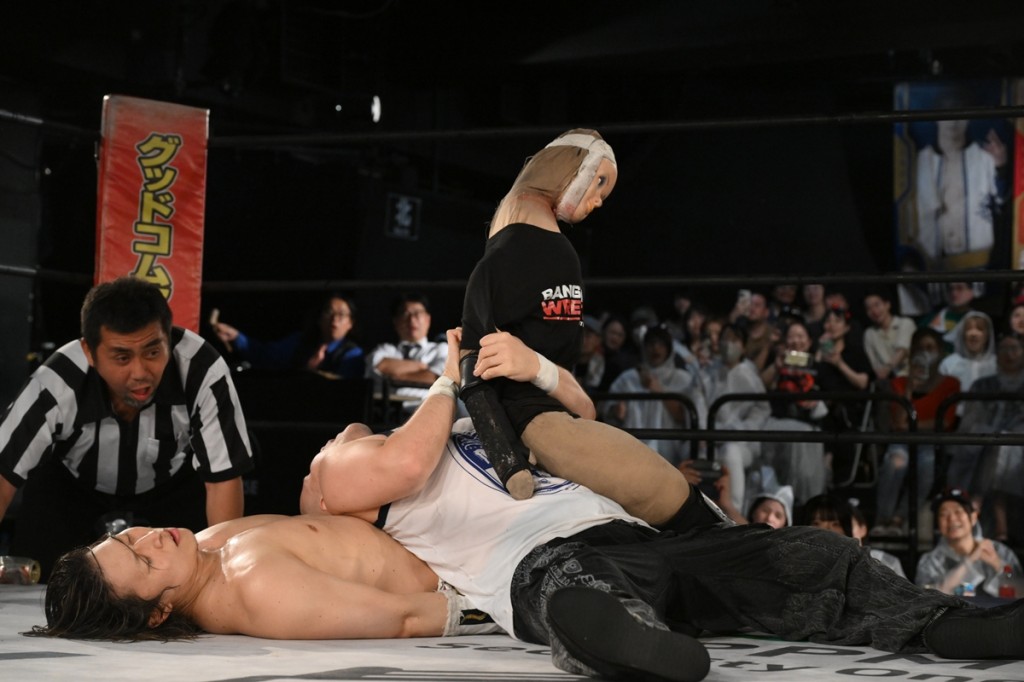 そんななか、場内が暗転すると、ヨシヒコが登場し、平田に輪廻転生を浴びせてKO状態。本多がディーノの尻にヨシヒコをぶち込もうとするが、ヨシヒコが踏ん張って逆に本多を地獄門へ。大ダメージを受けた本多はヨシヒコを抱える形で平田の体の上に倒れると、3カウントを数えられ本多の勝利。
