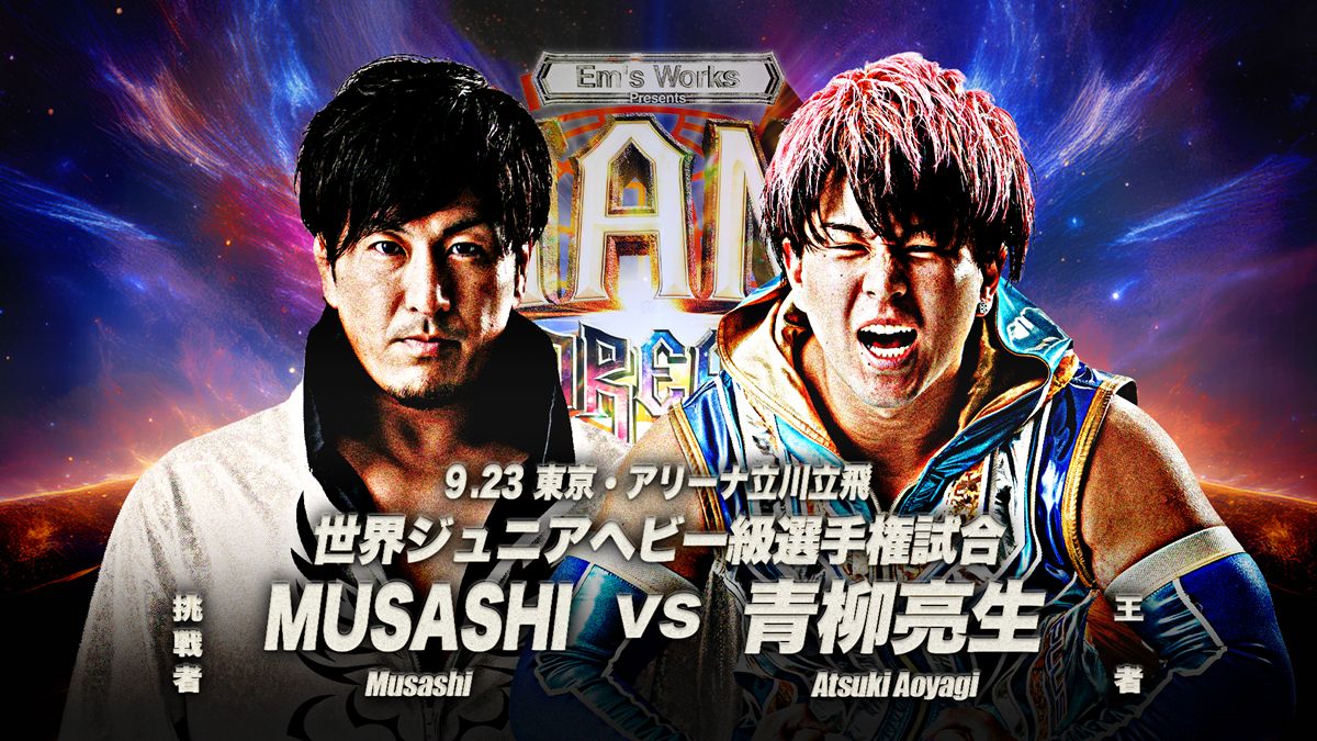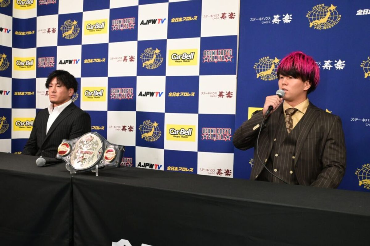 全日本プロレスは都内事務所で会見を開き、秋のビッグマッチ「ジャアントドリーム2025」(9月23日、東京・アリーナ立川立飛)で行われる世界ジュニアヘビー級選手権試合に向け、王者・青柳亮生と挑戦者・MUSASHIがそれぞれ意気込みを語った。