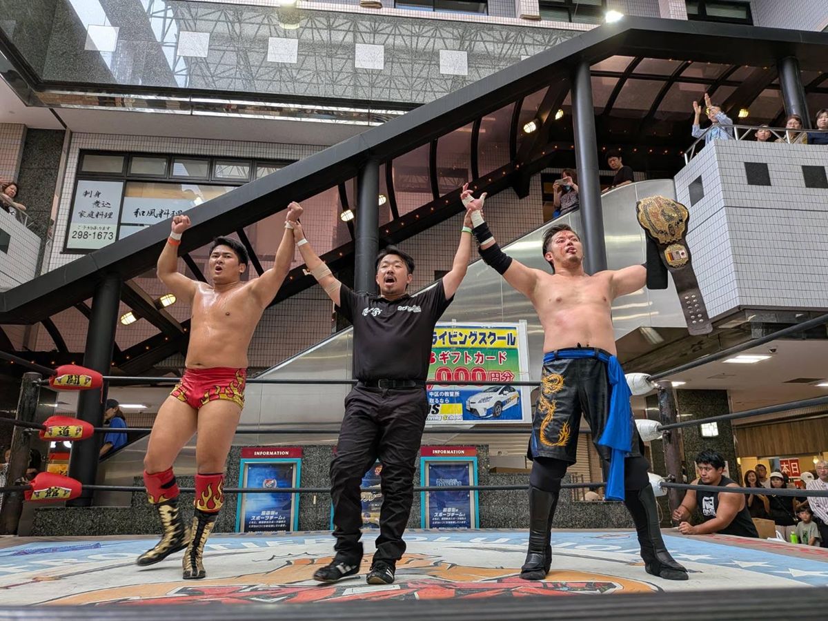 セミファイナルでは、菊田一美が関茂隆真を飛蝗脚で下しシングル戦で勝利。また、第2試合のタッグマッチでは、“破壊王子”橋本大地がパイルドライバーでジェイコブ・クレインを仕留めるなど、各選手が商店街の特設リングで躍動した。
