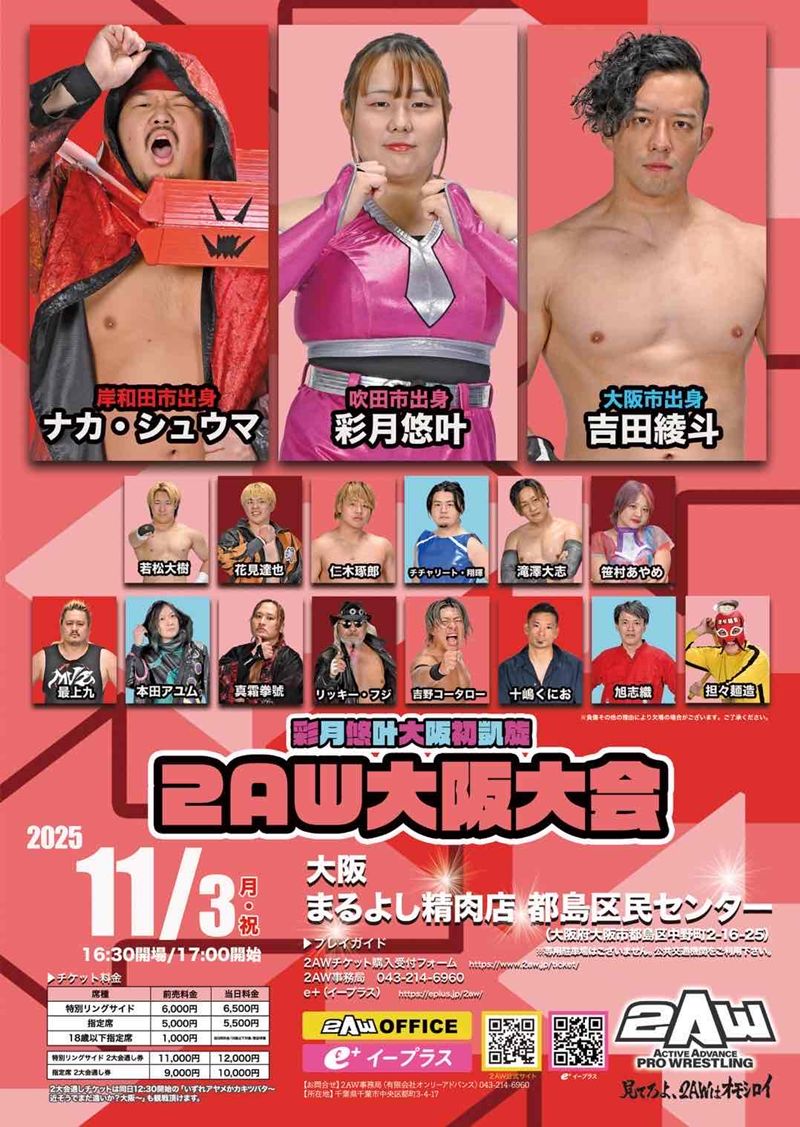 千葉を拠点とするプロレス団体「2AW」は、11月3日(月・祝)に大阪・都島区民センターで開催する、彩月悠叶の大阪初凱旋大会の全対戦カードを発表した。