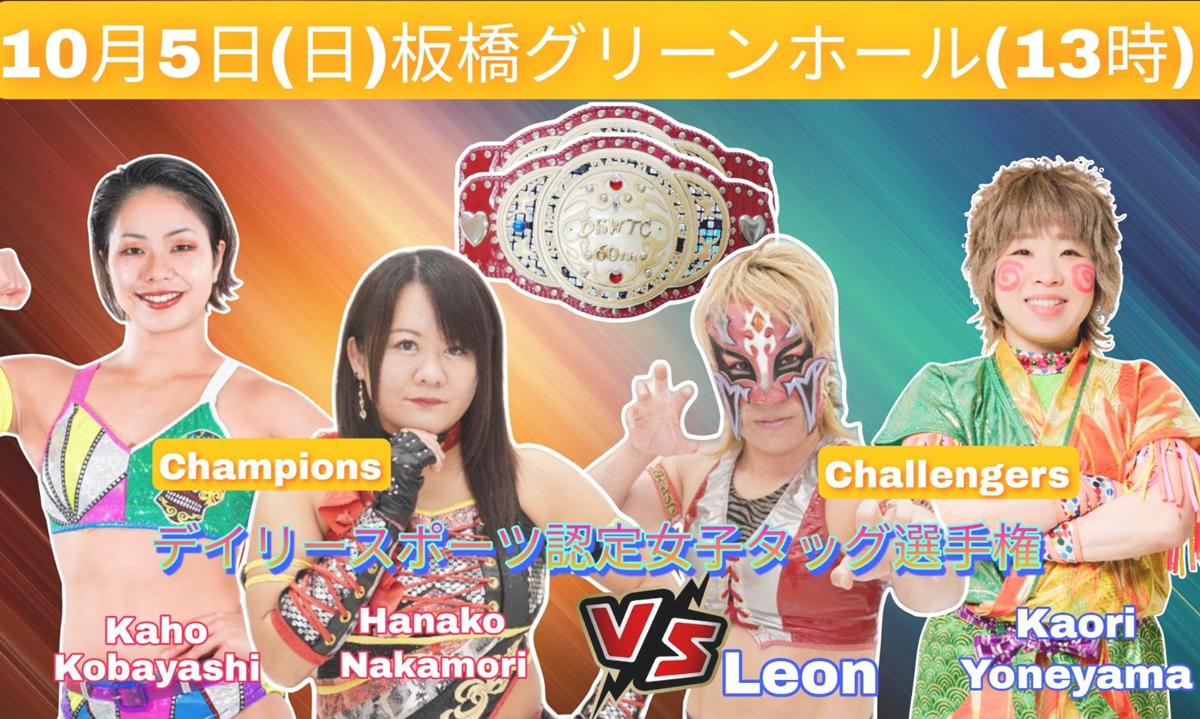 もう一つのタイトルマッチ、デイリースポーツ認定女子タッグ選手権試合では、王者組の中森華子&小林香萌に、Leon&米山香織という百戦錬磨のベテランコンビが挑戦する。