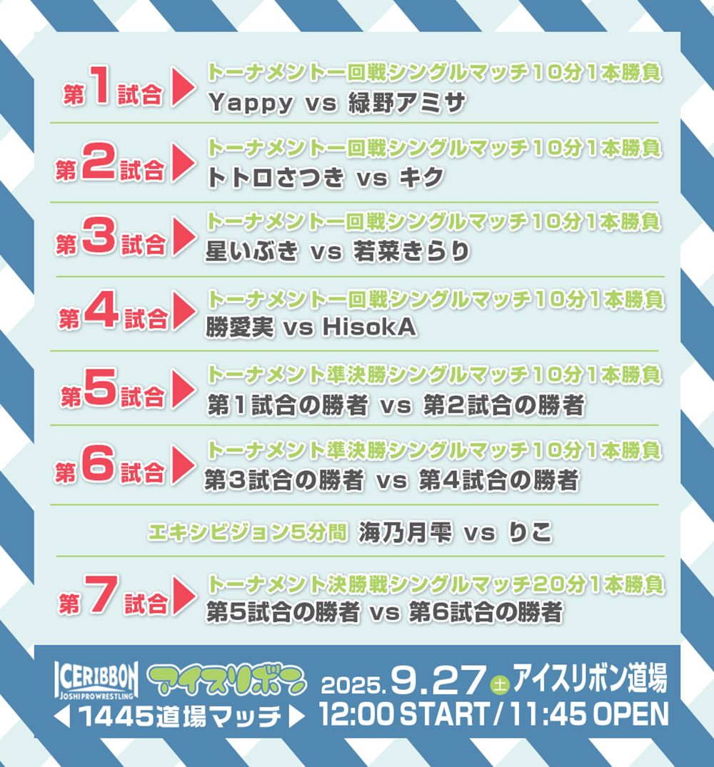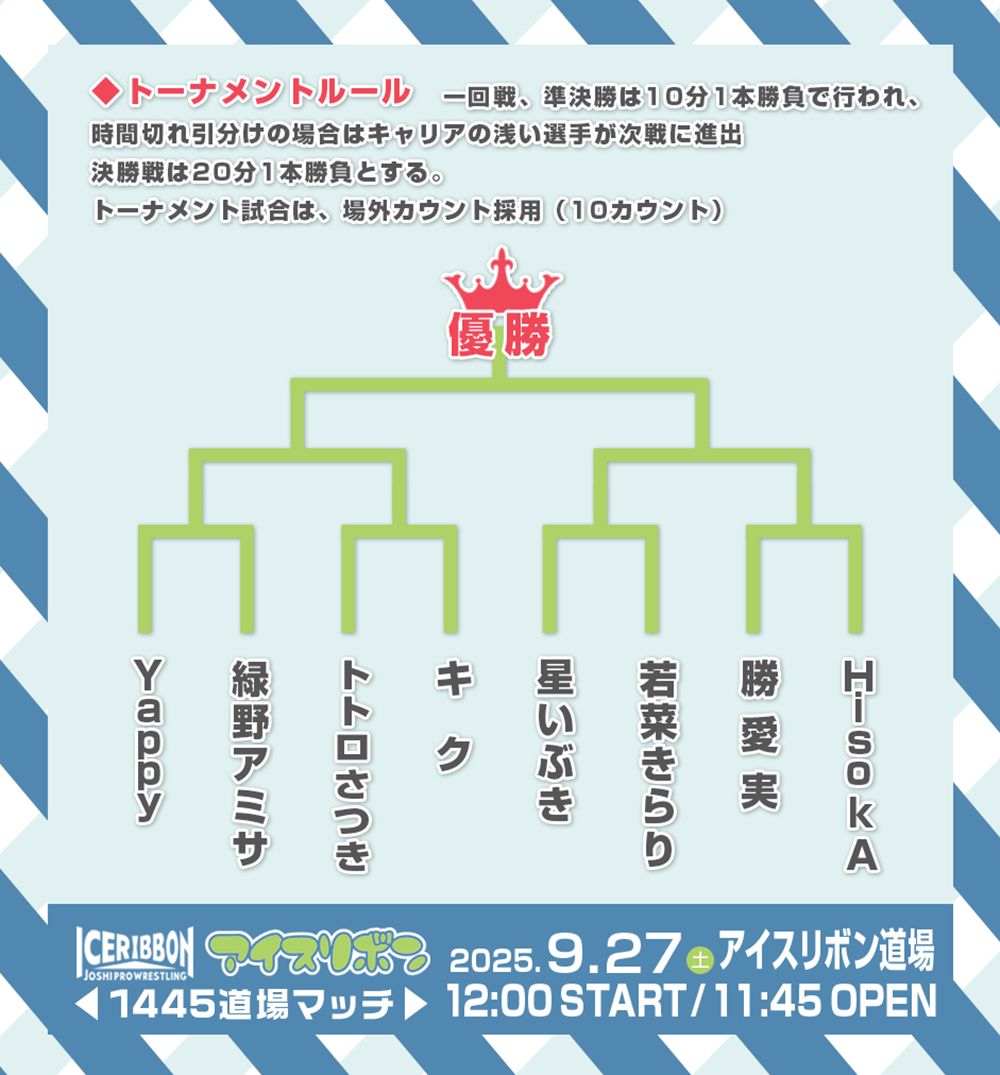 女子プロレス団体アイスリボンは26日、明日27日(土)に埼玉・アイスリボン道場で開催する「アイスリボン1445」で、8選手参加による1DAYシングルトーナメントを行うことを発表した。
