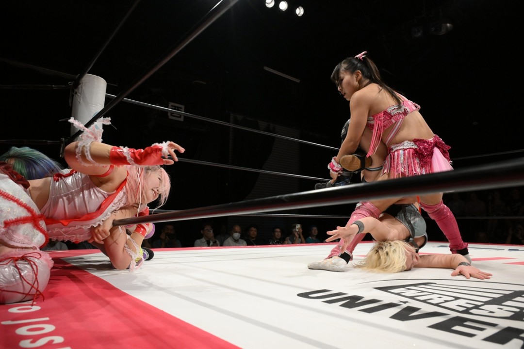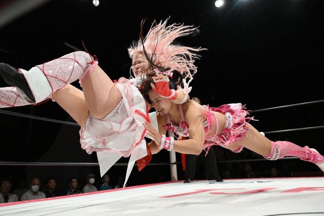 渡辺と愛野がエルボーのラリー。愛野がブルドッキング・ヘッドロックからヴィーナスDDTを狙うも、回避した渡辺が瞬間的にティアドロップを見舞って排除。